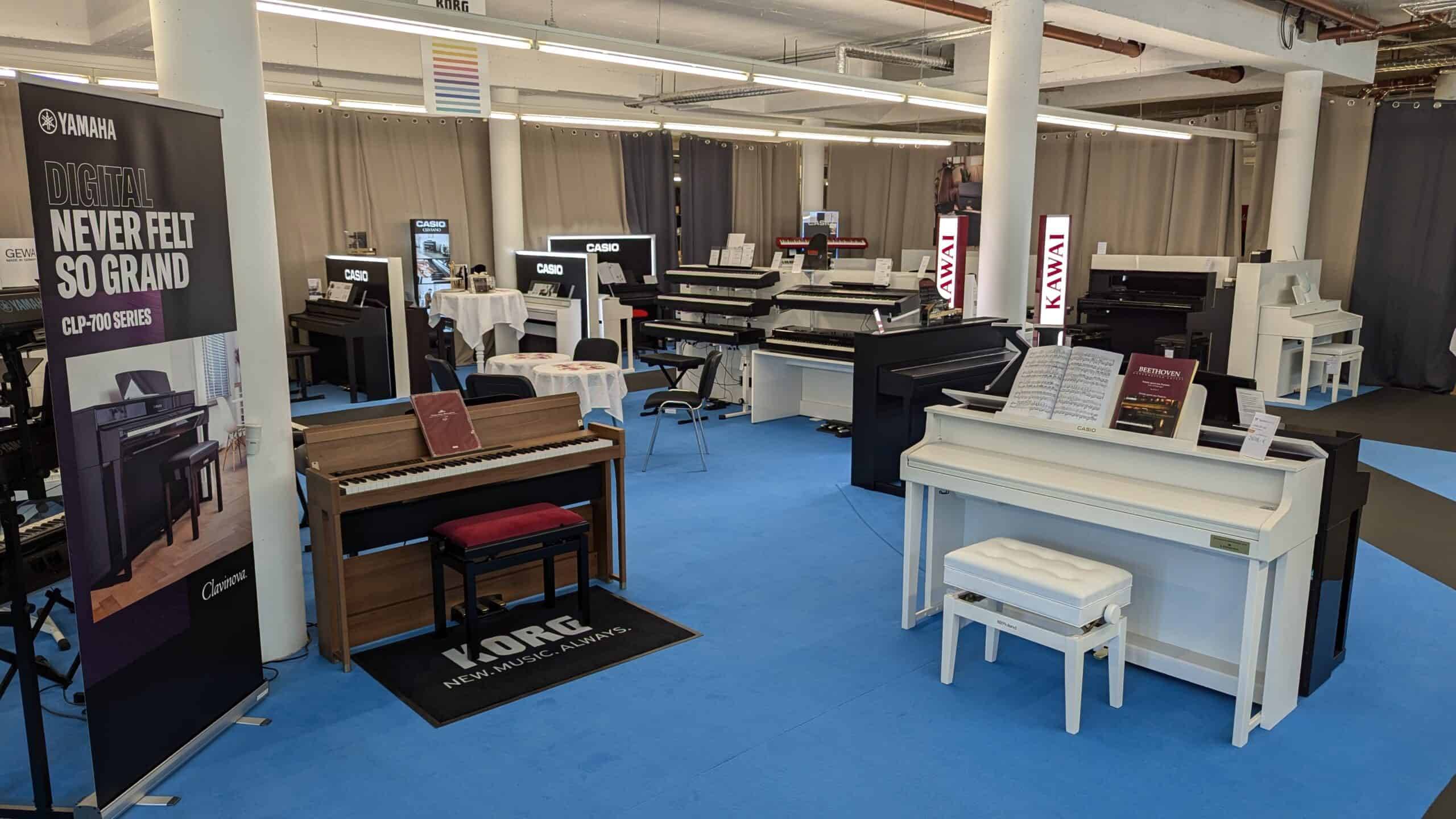 Mit über 250m² Ausstellungsfläche und mehr als 100 Instrumenten präsentieren wir Am Wiesengrund 2 in 13158 Berlin die größte Ansammlung aller aktuellen digitalen Tasteninstrumente in Berlin und Brandenburg. Berühmte Marken wie Yamaha, Kawai, Casio, Roland, Nord, Korg und weitere stehen hier nicht in jeweils verschiedenen Läden, sondern zum Anspielen direkt nebeneinander.
